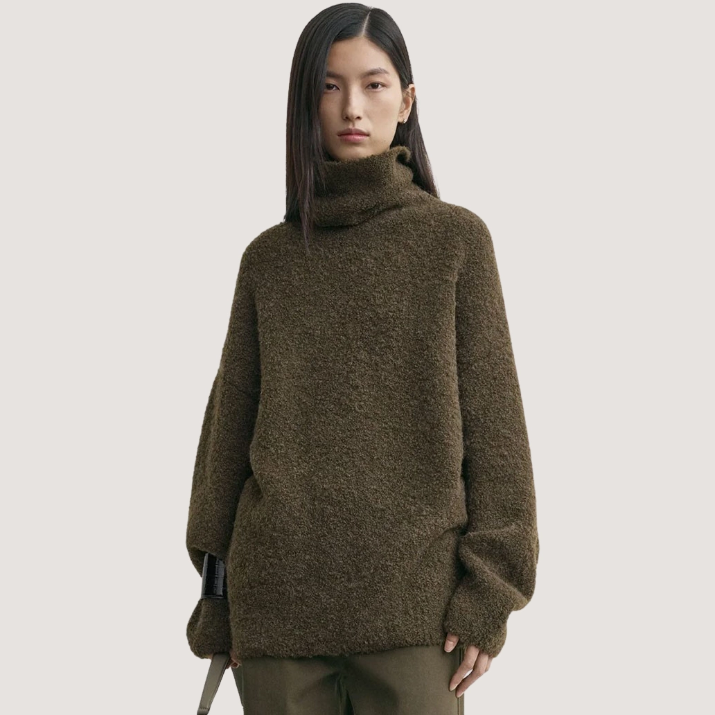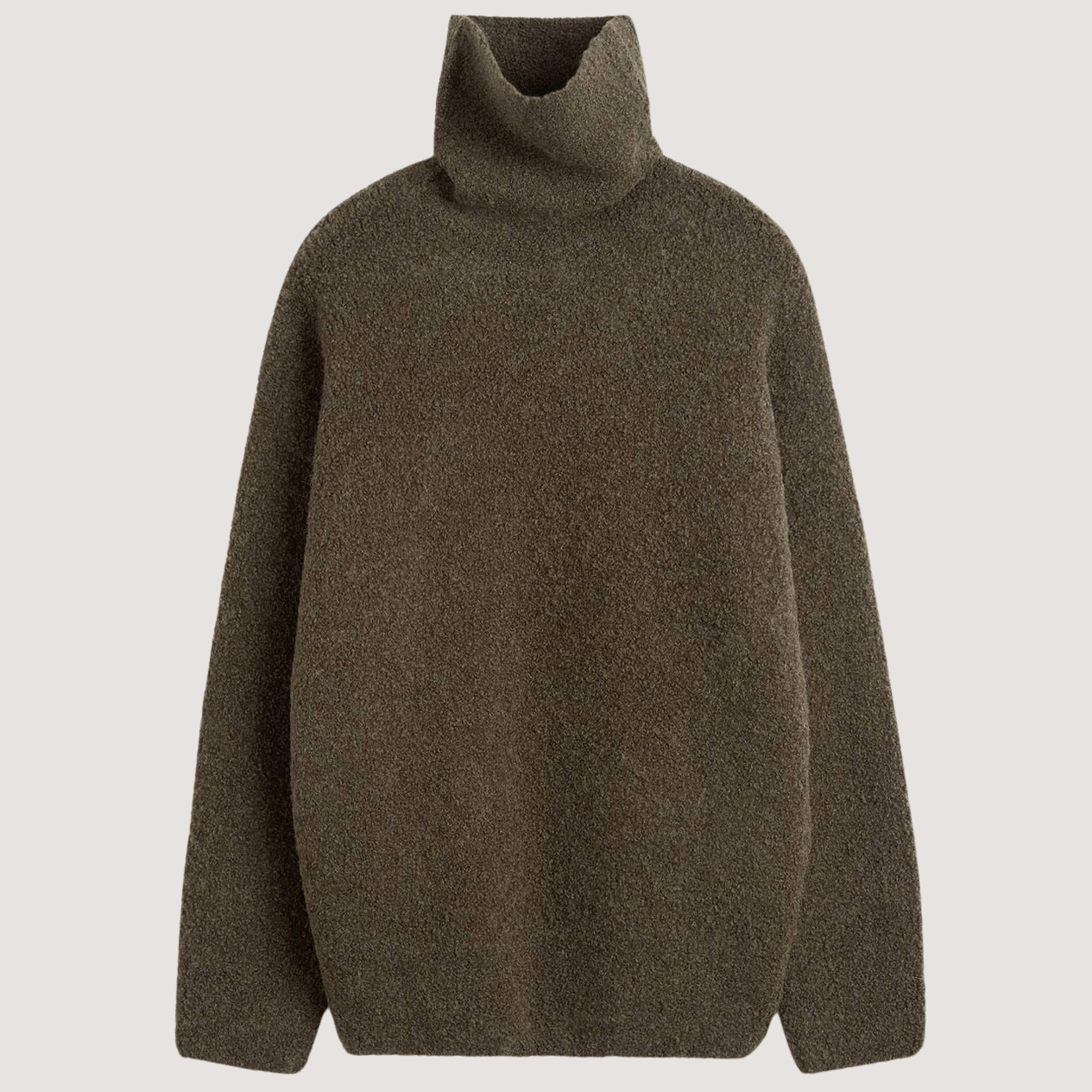 Oversized turtleneck sweater in alpaca-blend bouclé with a soft teddy texture. It has an inverted trapeze silhouette with low and spacious armholes channeling a relaxed mood. Balance the ample silhouette with fluid trousers.