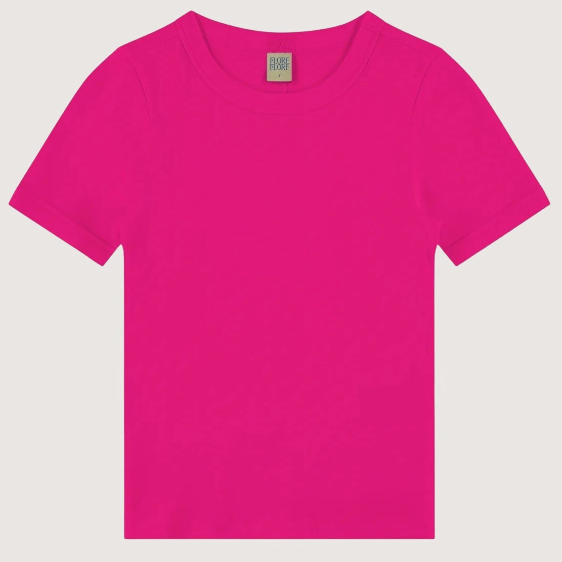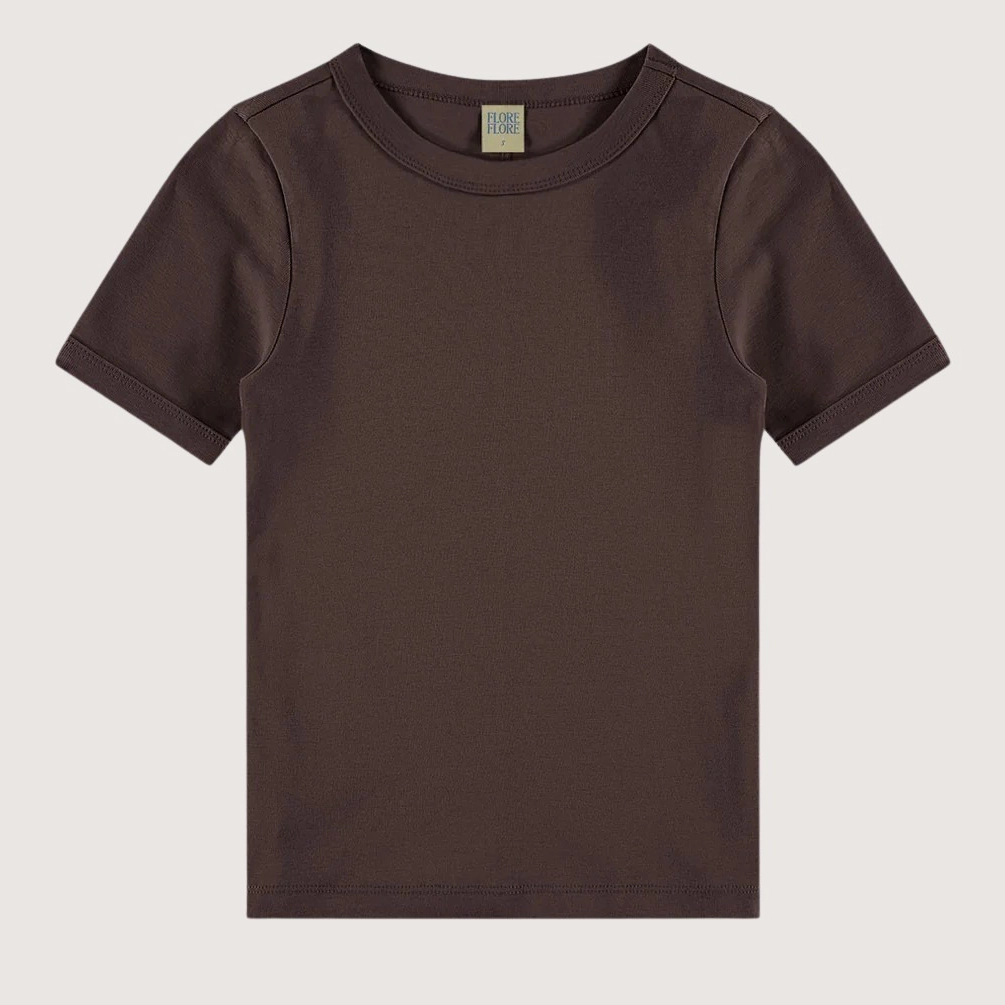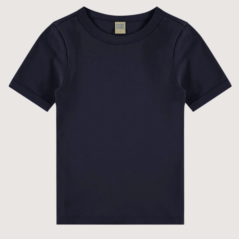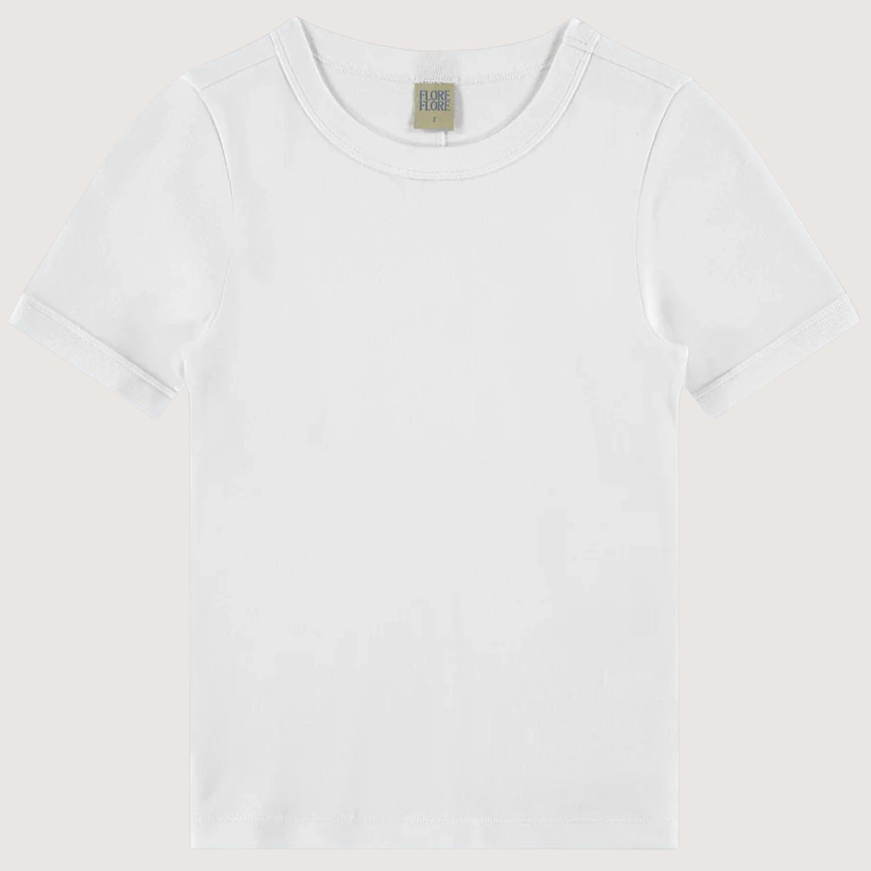 A fitted tee with a lengthened short sleeve, round bindings, and a double-stiched cut-off seam on the back. Made from soft, medium-weight organic cotton rib, perfect for layering under our Zoe Shirt.