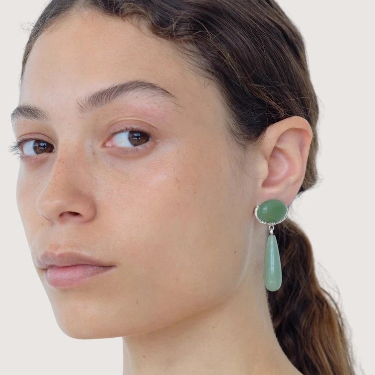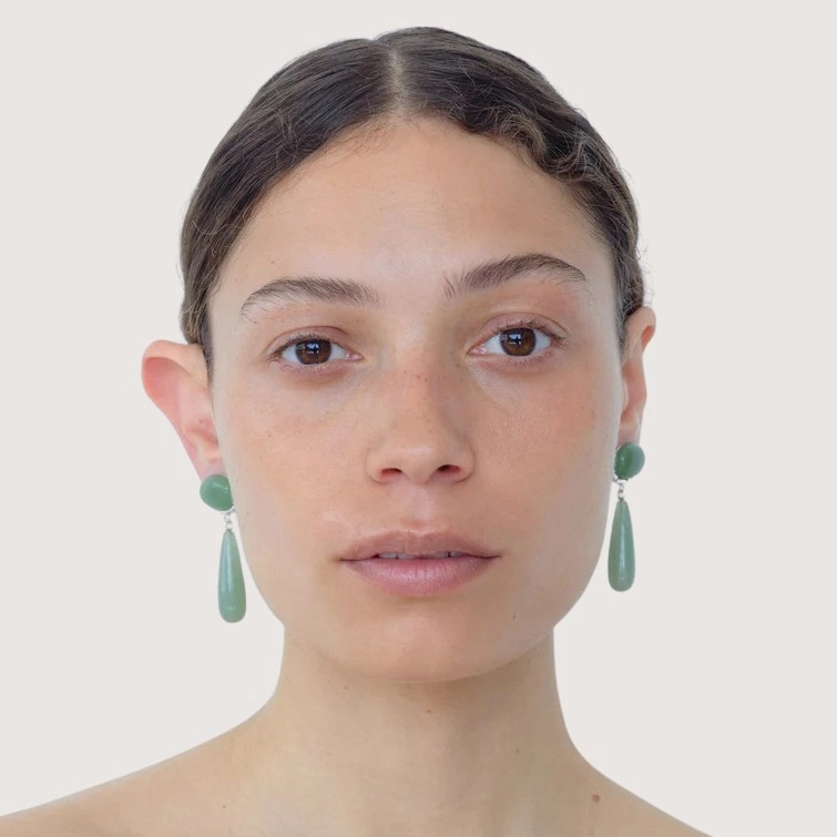 Handmade earrings in a larger but still as modern and yet classic version of our embleme aventurine earrings. made in recycled sterling silver featuring round and long dangling drop aventurine stones. embleme grande aventurine earrings is a part of our cadence collection. the earrings have a stick on the back and comes with a butterfly lock.