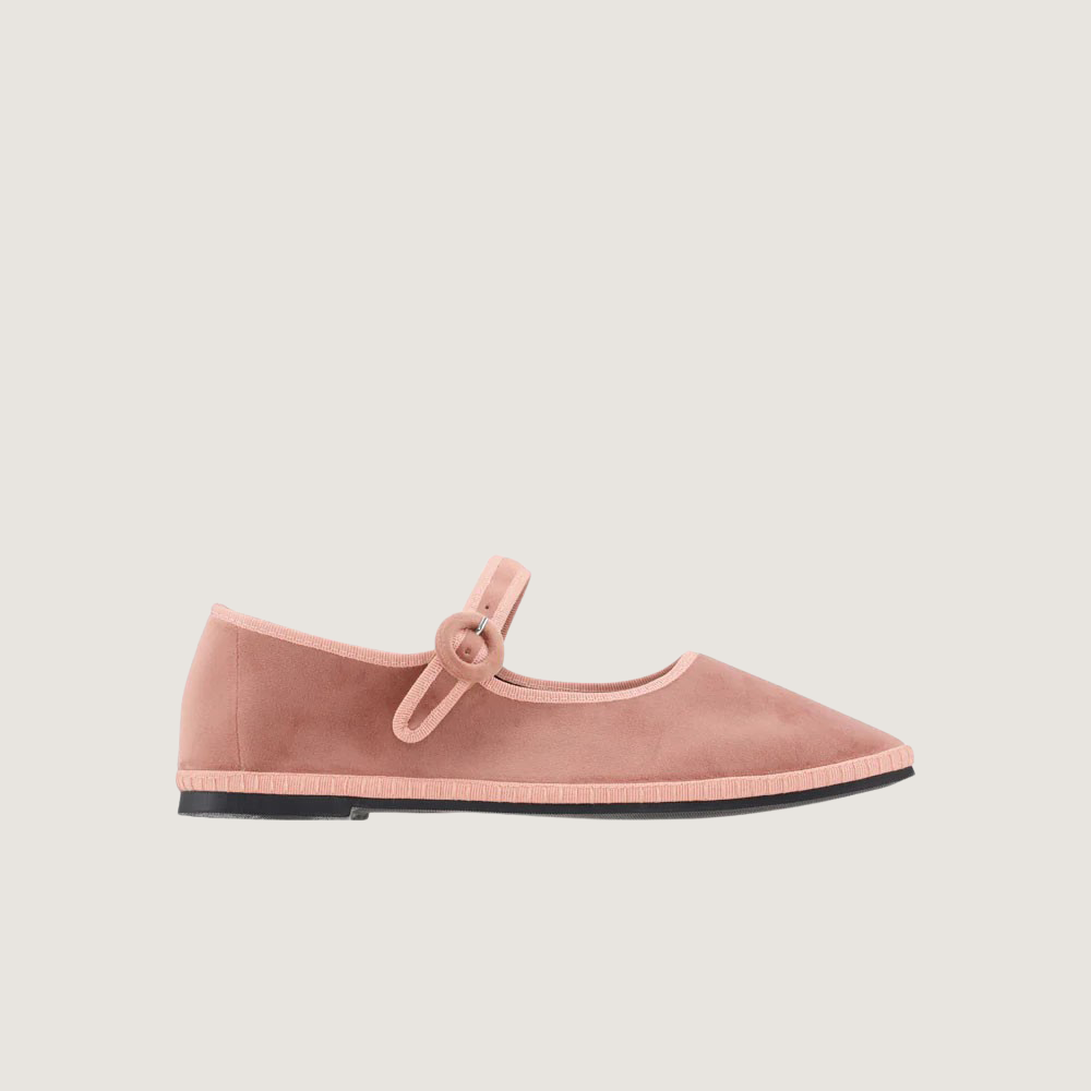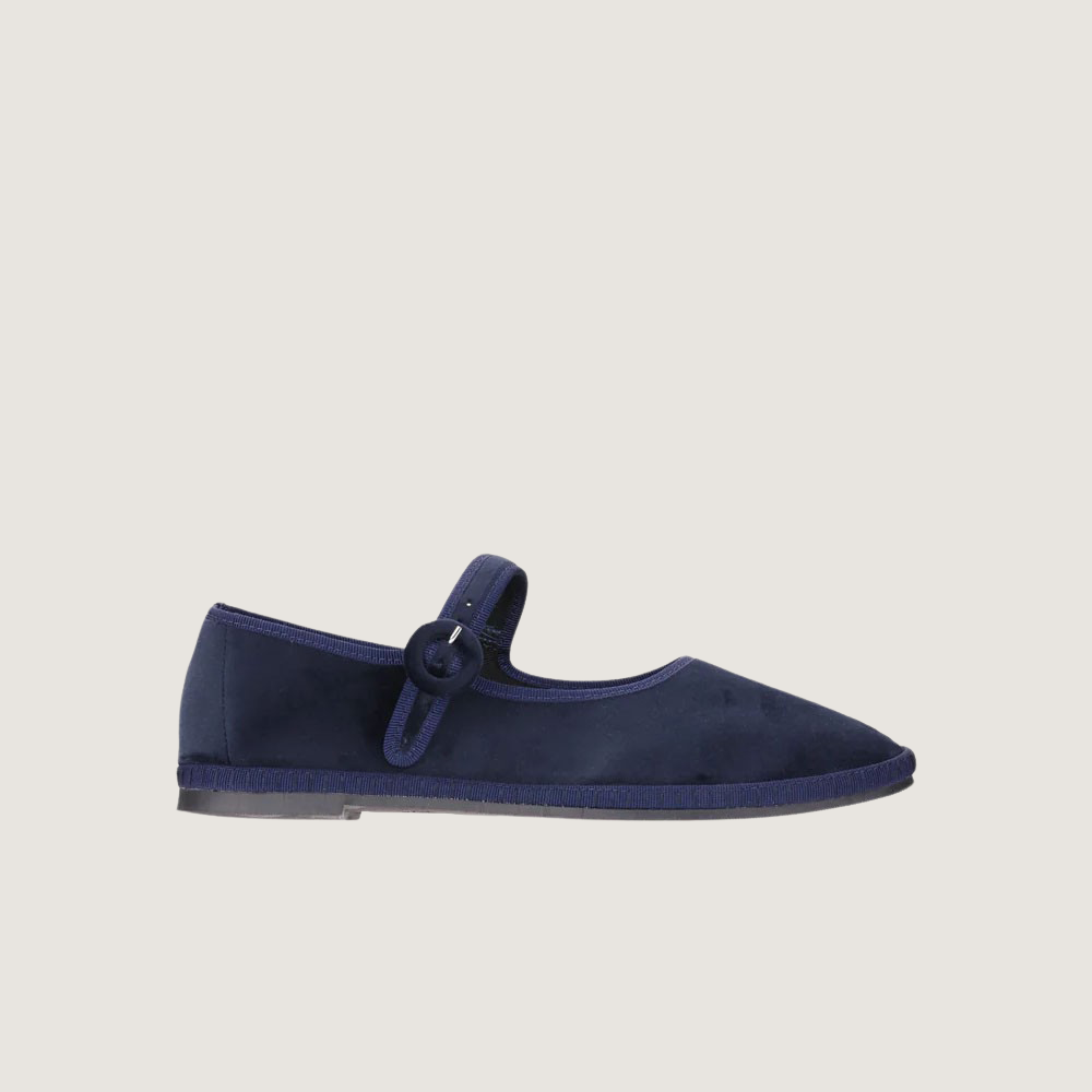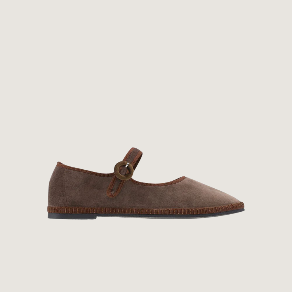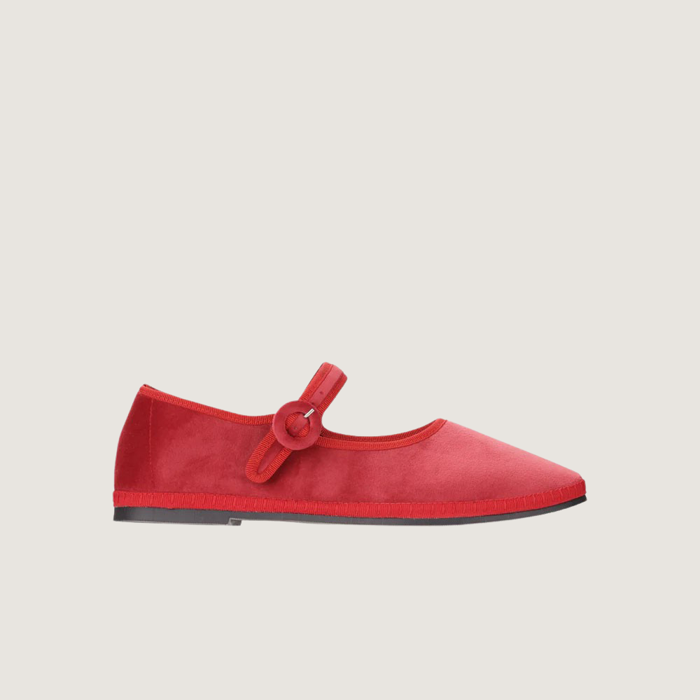 Description A take on a modern ballerina mixed with the classic features of a Mary Jane. The shoes have a flat sole with a small heel, a buckle closure over the foot, and a closed rounded toe.