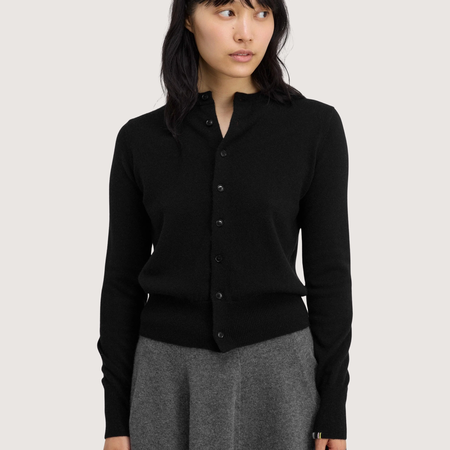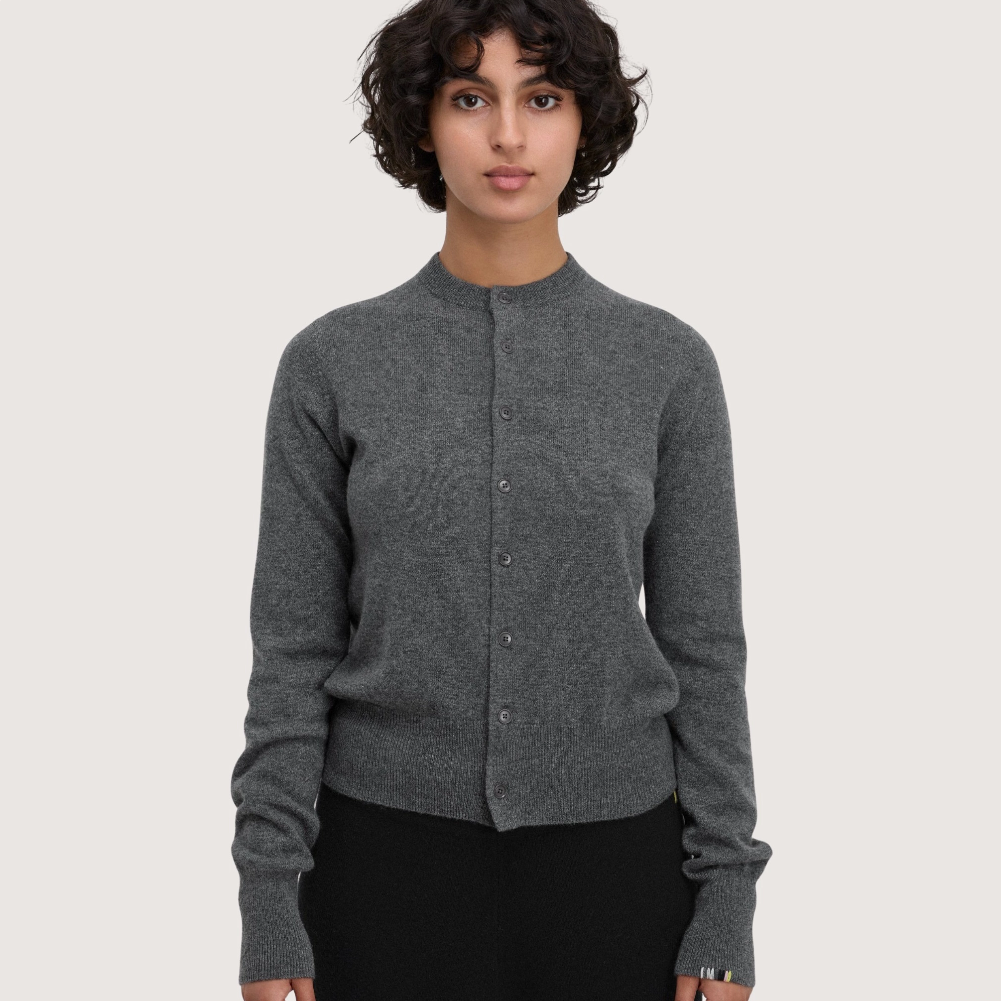 classic cashmere crew-neck cardigan with eight buttons and a petite fit. the buttons are made of highly durable corozo, a completely natural, chemical-free material derived from the seed of a palm tree.