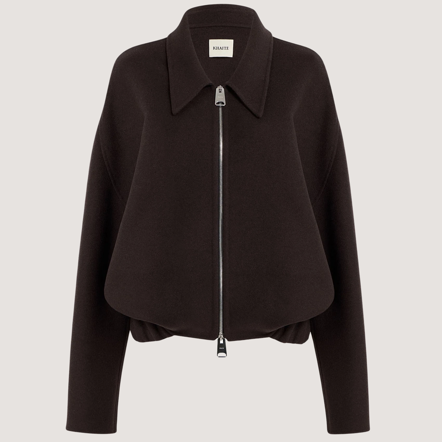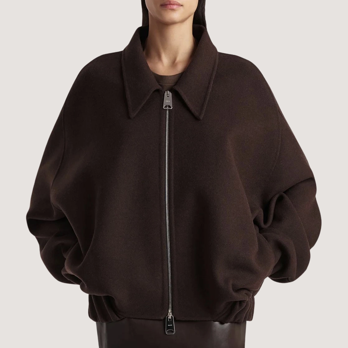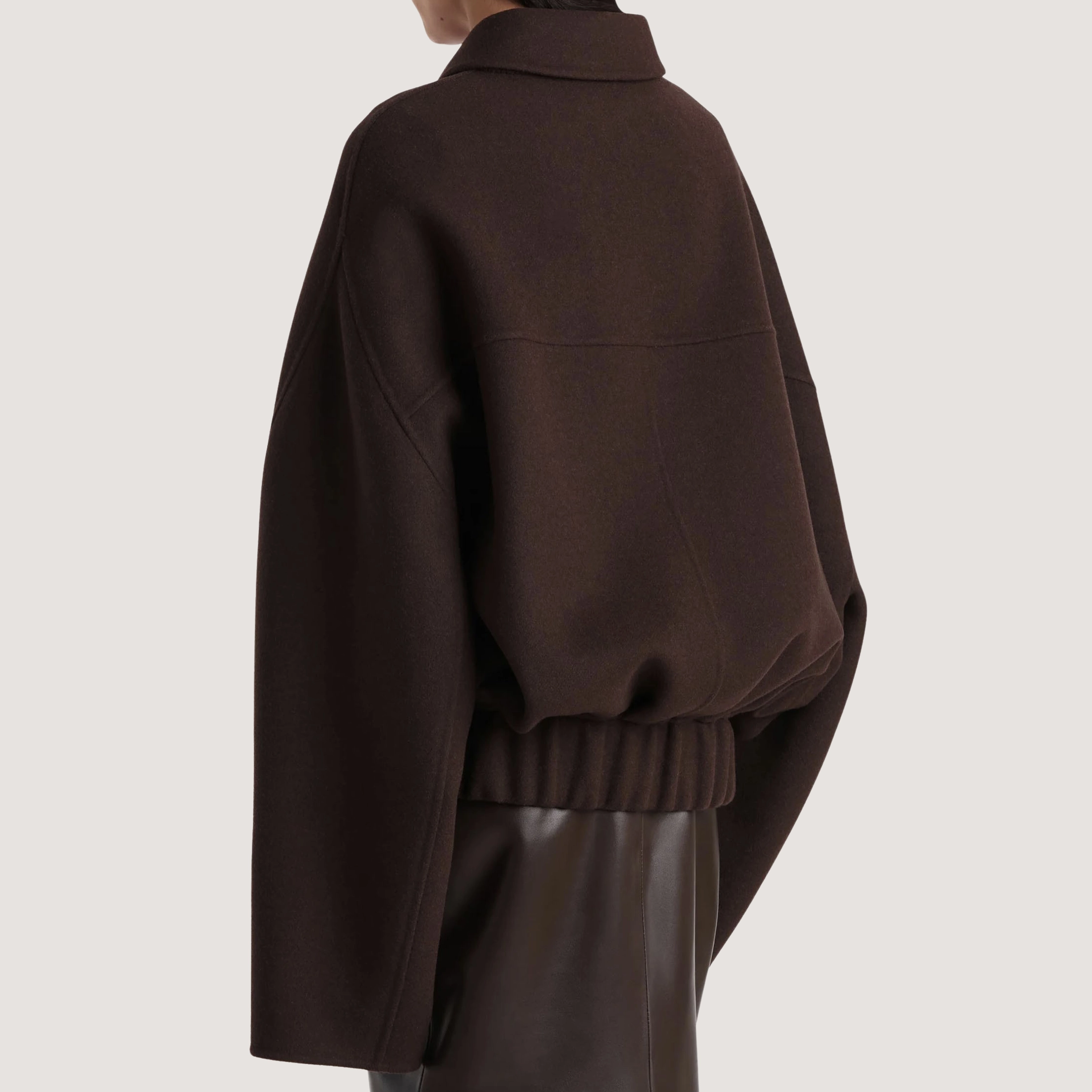 A sculptural yet stripped-down bomber in double-faced wool. Relaxed and rounded blouson silhouette with dropped shoulder seams and ruching at elasticated hem. Elongated collar and sleeves. Signature hardware at two-way zipper. Side pockets.