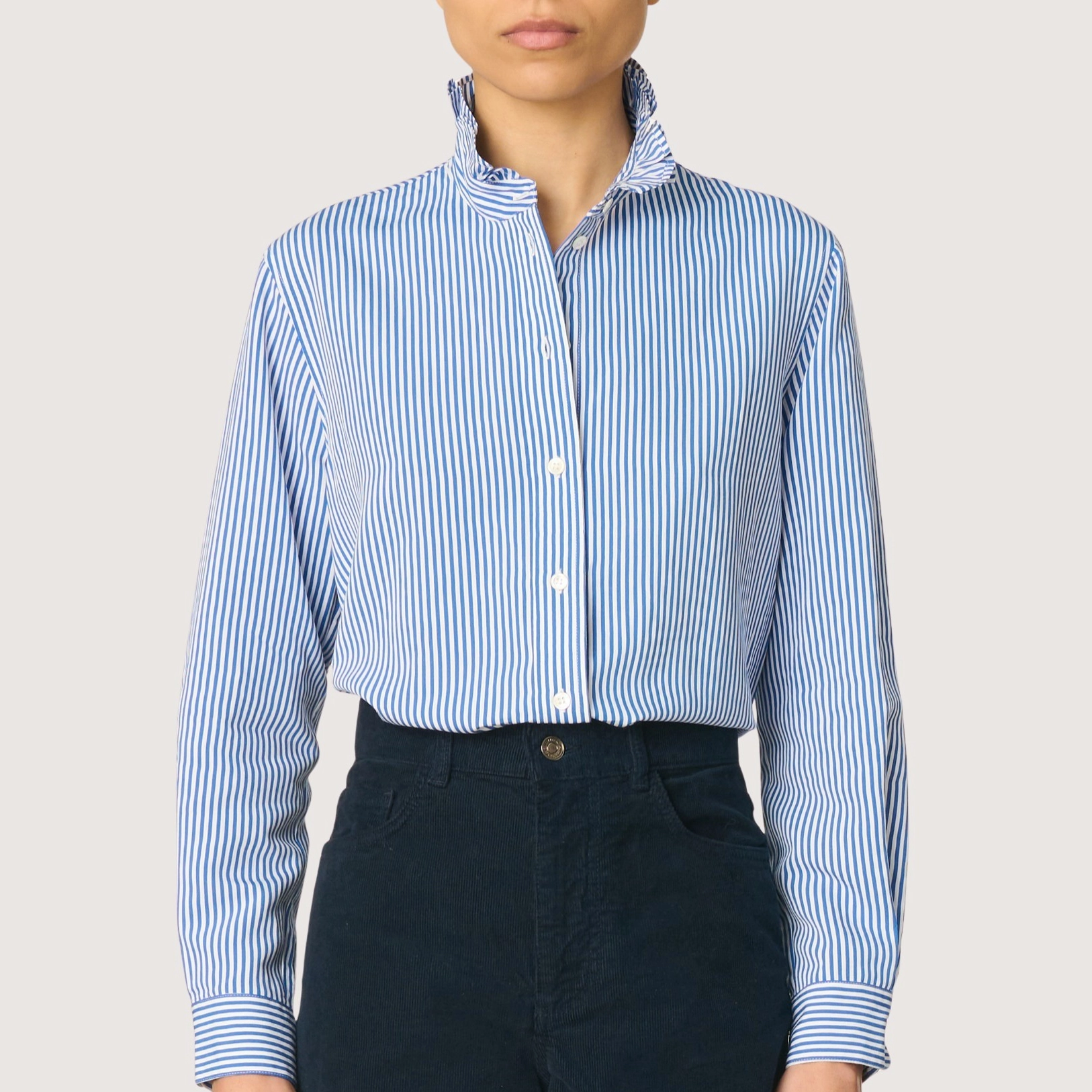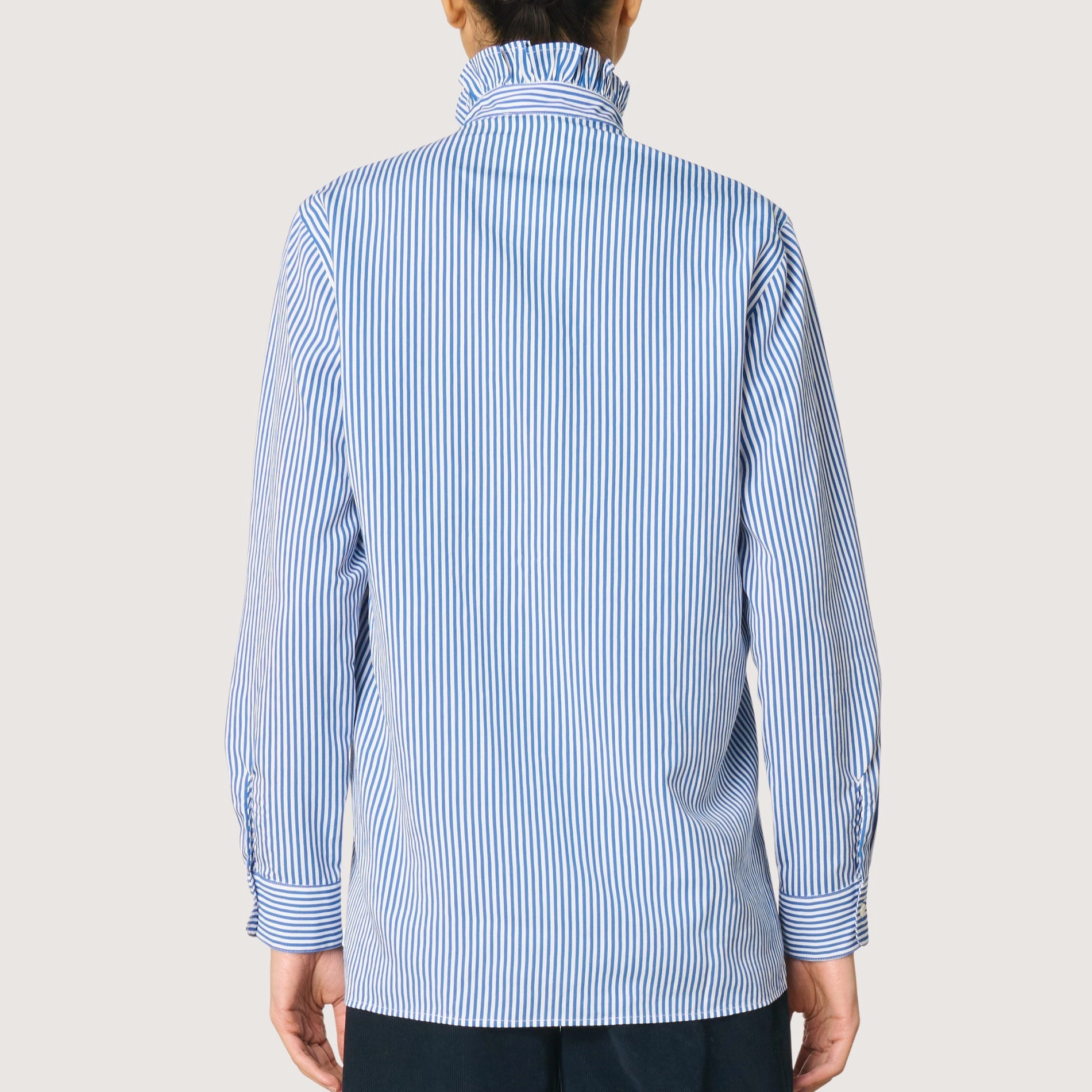 Ruffled stand-up collar. Slightly fitted straight cut. Vertical stripes. Button placket. Buttoned cuffs