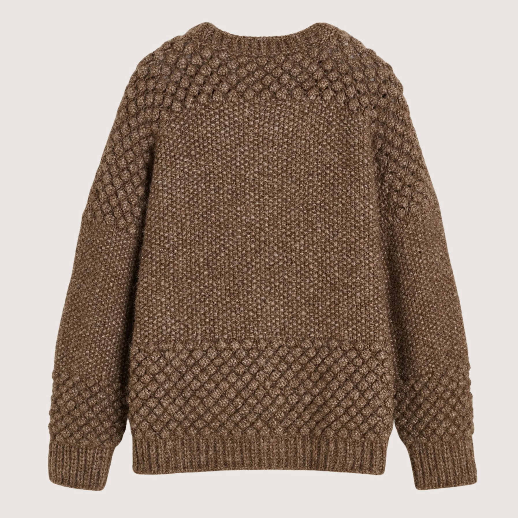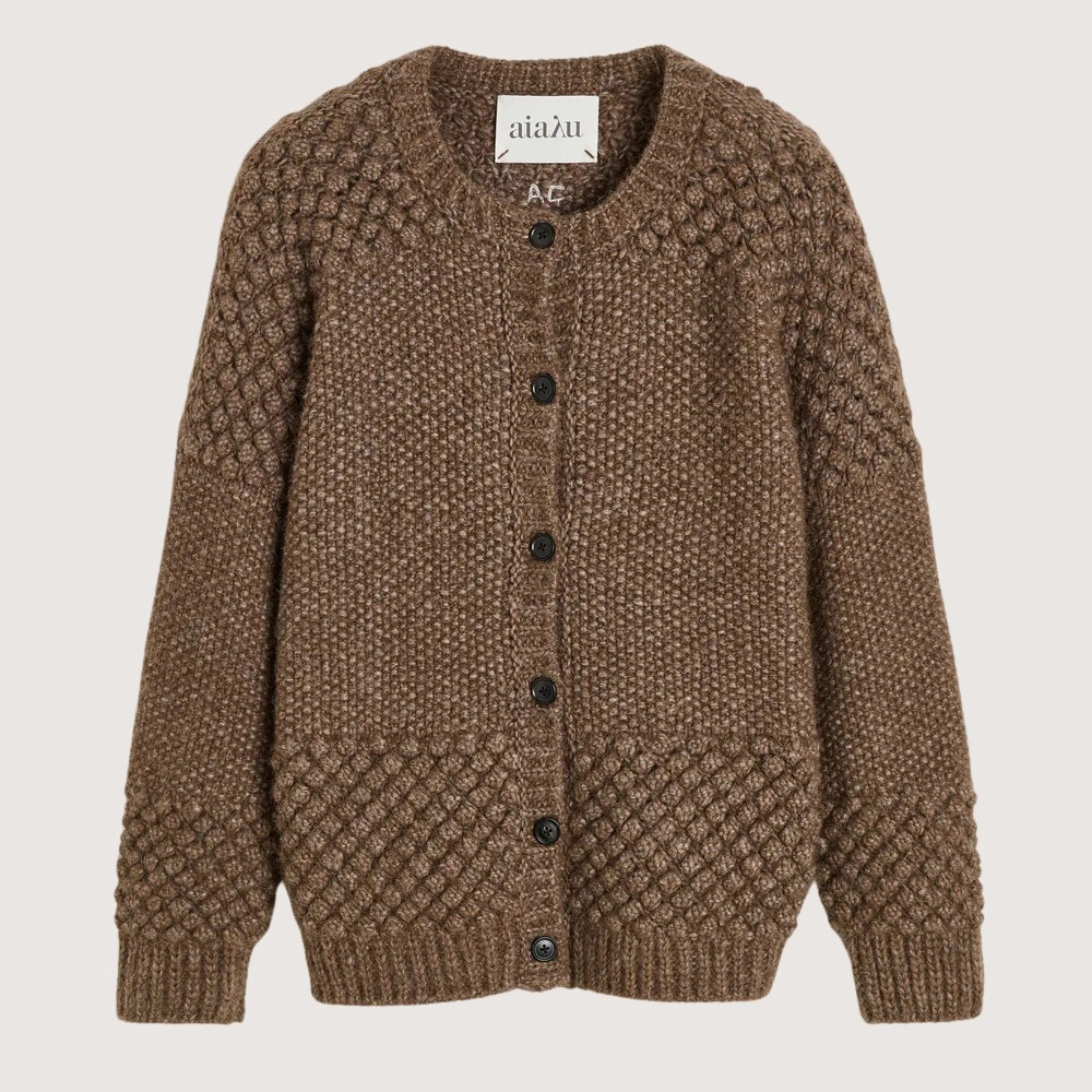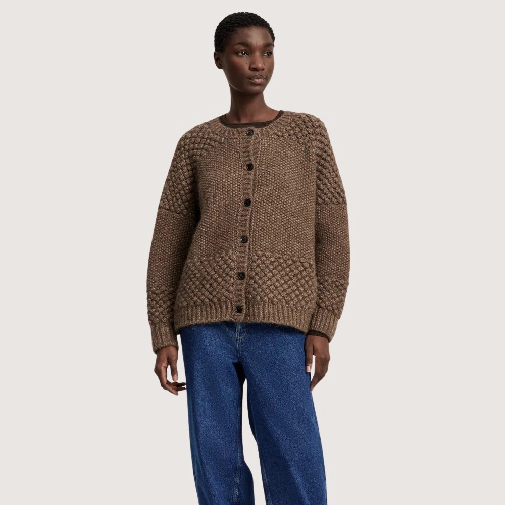 A fluffy, voluminous cardigan made from undyed, soft llama fibers. Hand-knitted using traditional techniques, combining refined seed stitch with delicate mega-seed details. Designed in an oversized fit with dropped shoulders and handcrafted horn buttons. Composition: 75% llama / 25% recycled polyamide – Bolivia.