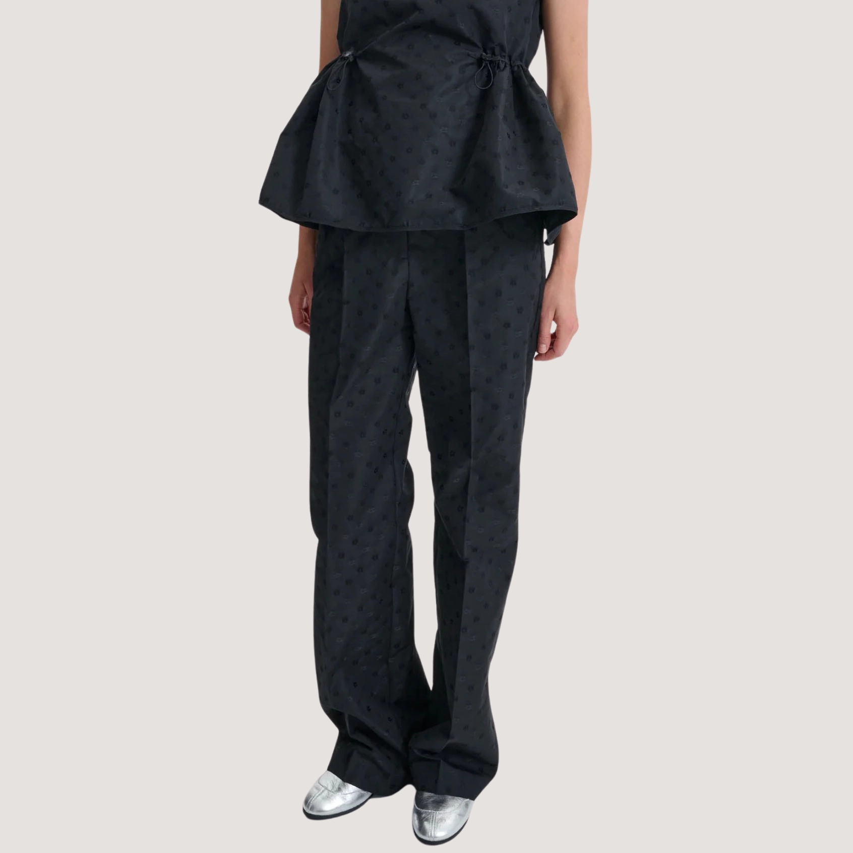 Description Clean and understated, Sonja trousers in iris jacquard. High-waisted and ankle-length, they fall in a straight-leg silhouette that feels effortless yet refined. Subtle detailing—from side inset pockets to rear welt pockets and a front button-and-zip fastening—adds quiet structure, making these trousers a modern, versatile staple.