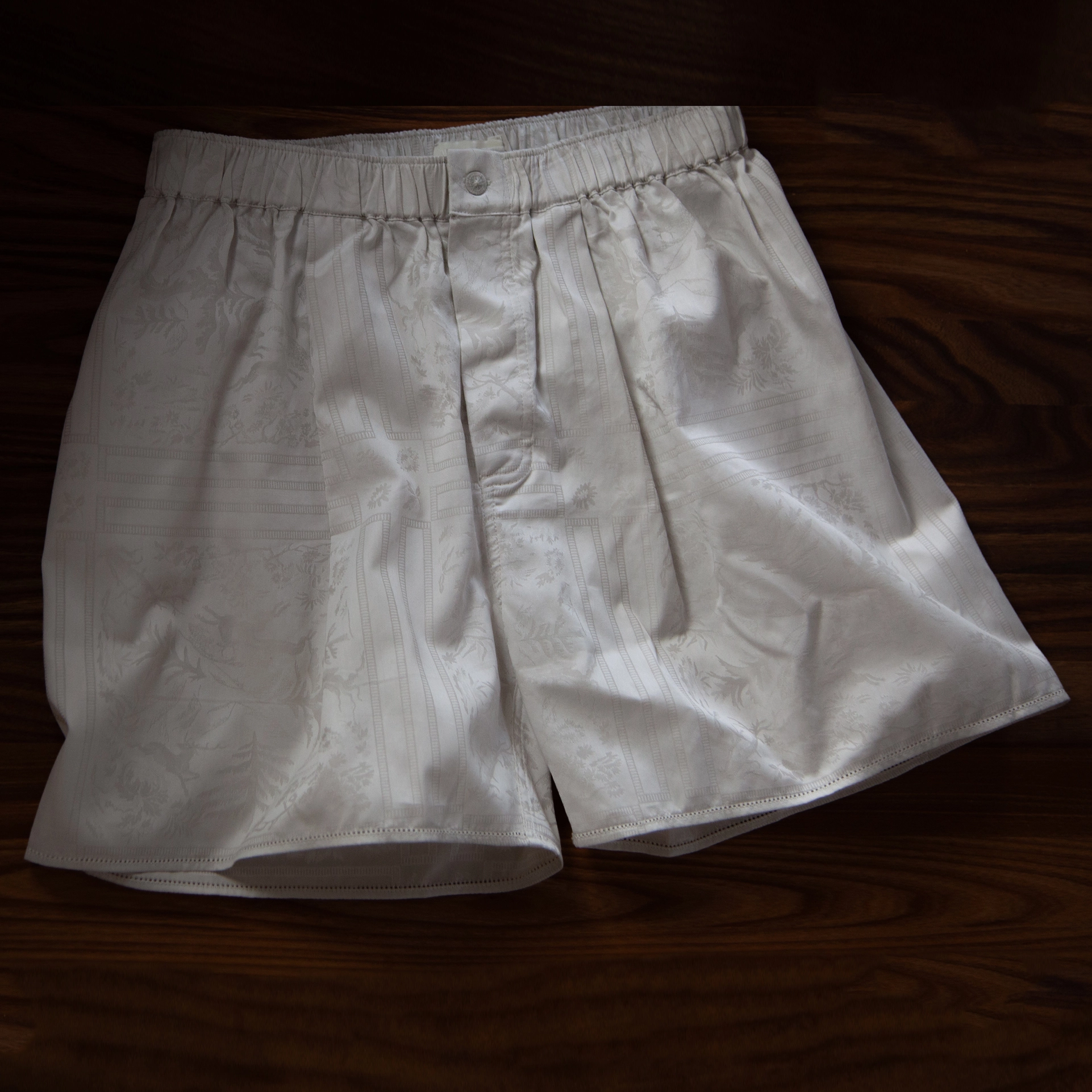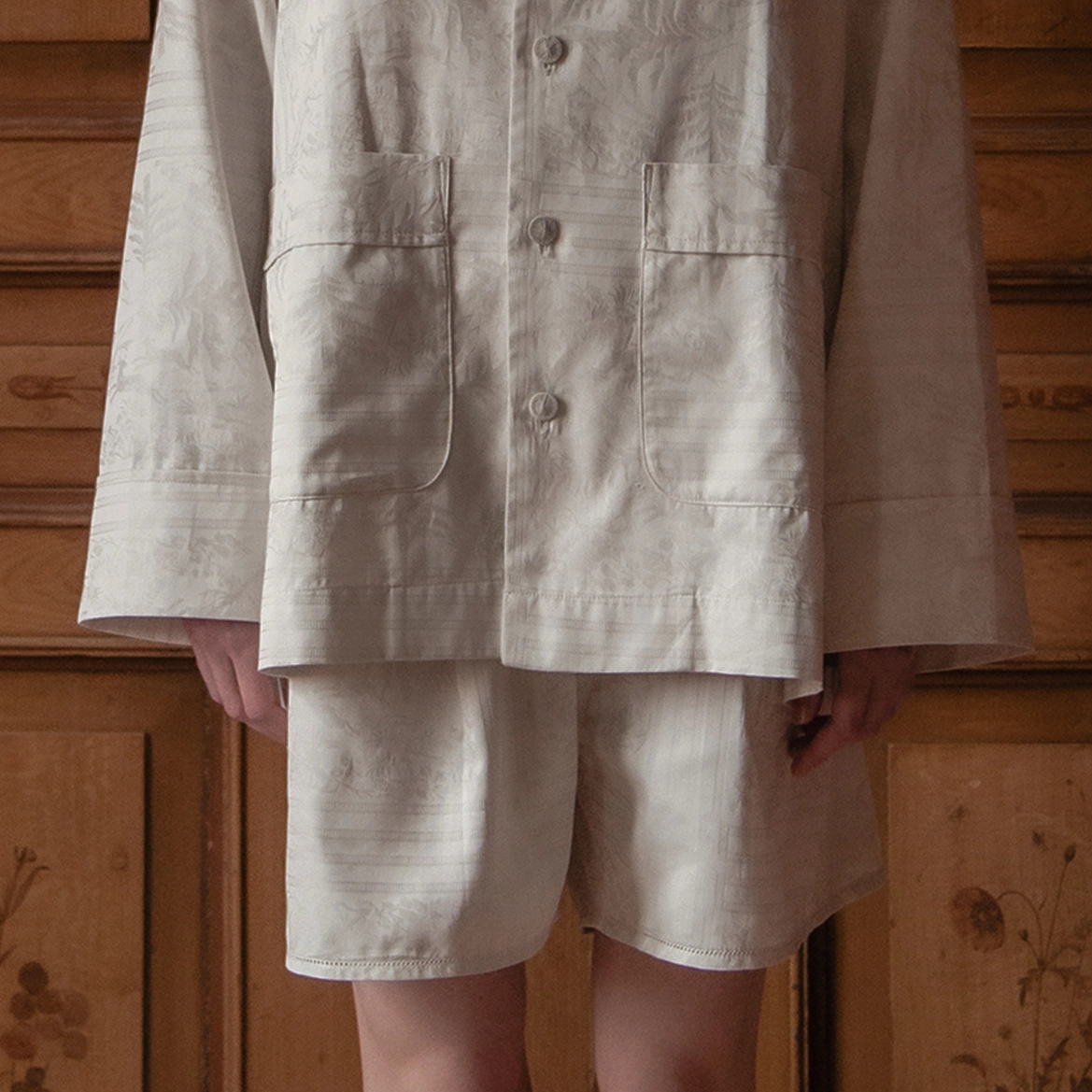 The sophisticated Wonder Scape Classic Boxer is elegantly tailored for both men and women in our luxurious, drapey, damask-woven fabric. The Wonder Scape jacquard motif revives an old genre scene, portraying a hunting narrative set in the Danish woodlands. Yarn-dyed in delicate shades of white chalk and pale ash grey, creating a timeless, elegant