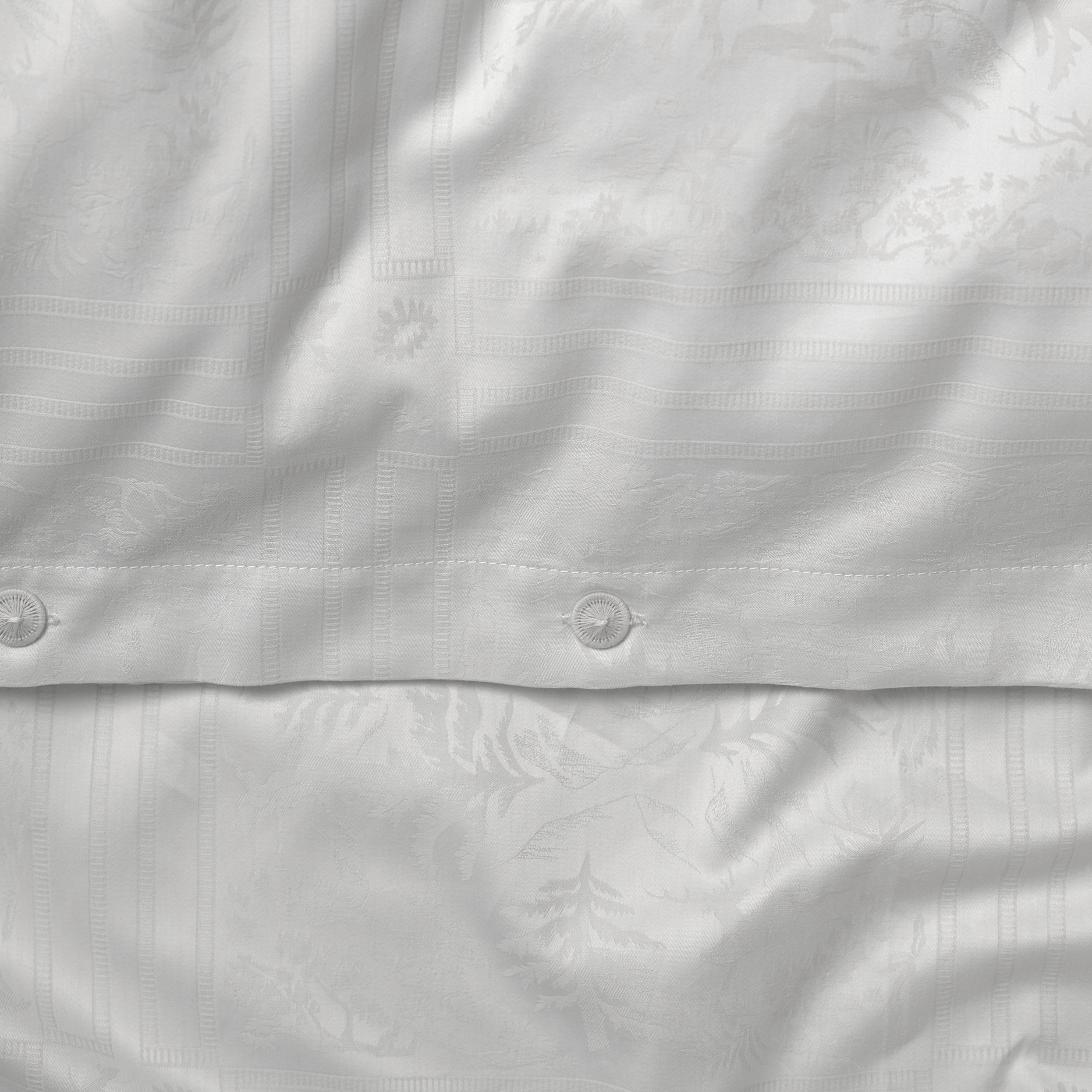 Wonder Scape relaunches an old genre scene, portraying a hunting narrative set in the Danish woodlands - envisioned as a symbol of endurance and deep respect for nature and the forces that live within it. The vital scenes of wonder are framed and composed in a grid, creating a check pattern. Yarn-dyed in delicate hues of white chalk and pale ash grey creating a timeless, elegant simplicity.