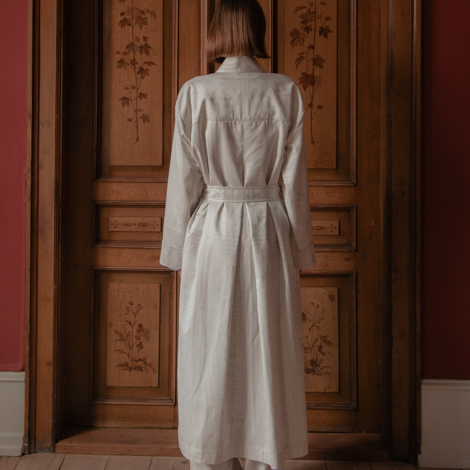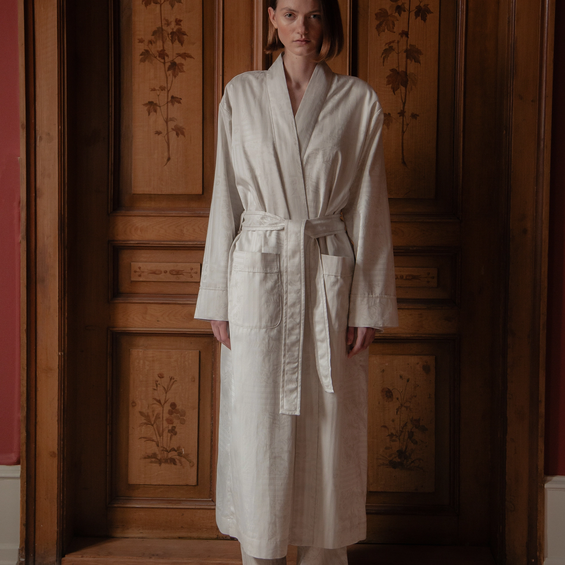 The Wonder Scape House Robe offers modern elegance in a luxurious, drapey, damask-woven fabric tailored for both men and women. The Wonder Scape jacquard motif revives an old genre scene, portraying a hunting narrative set in the Danish woodlands. Yarn-dyed in delicate hues of white chalk and pale ash grey, creating a timeless, elegant simplicity.